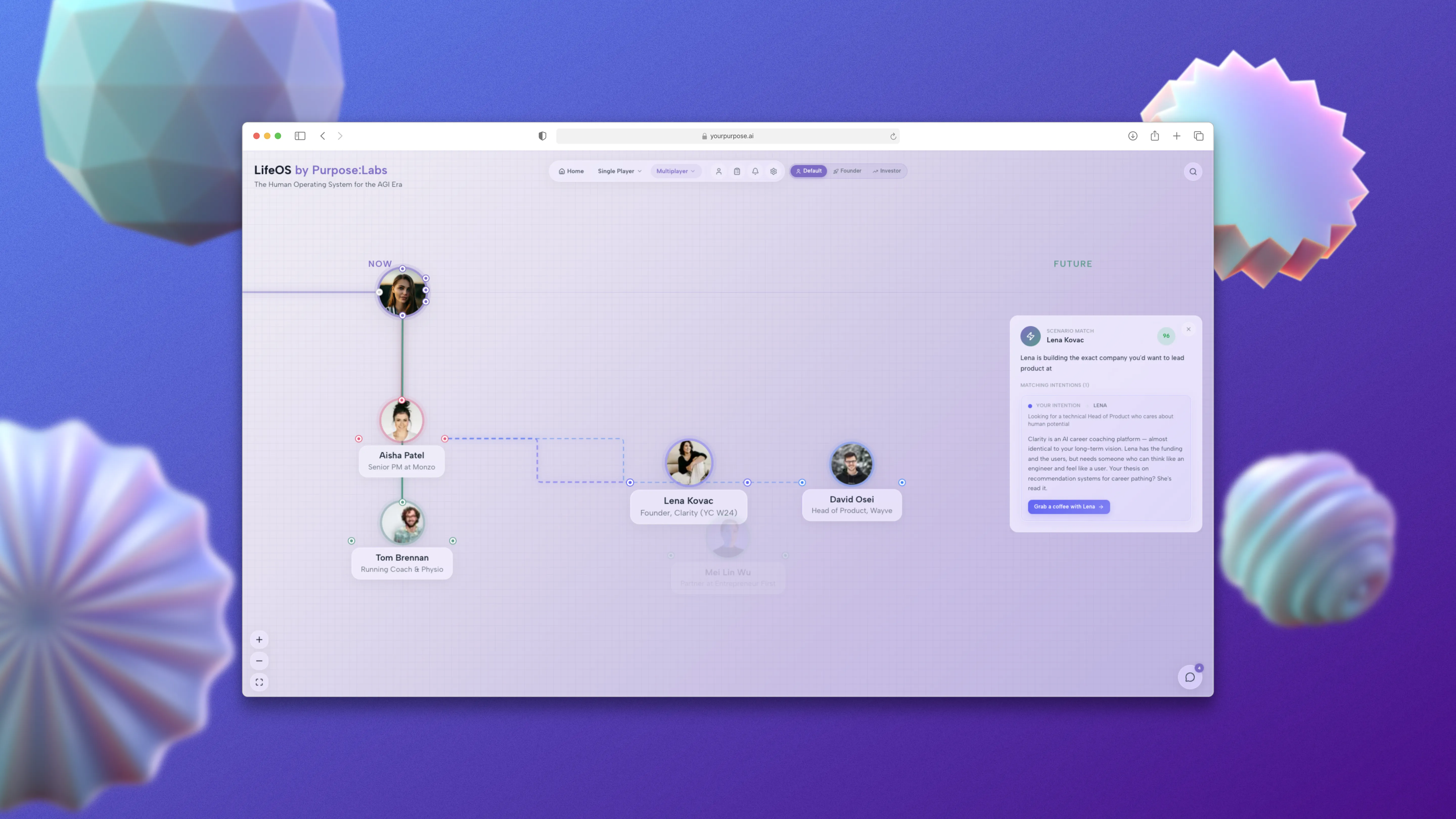 Your Personal Context Graph knows what you are working on, what you need, and what you bring. Our Large Human Model scans every other human's context graph in real time. When two graphs click, LifeOS makes the connection. No searching. No scrolling. No asking for intros.
